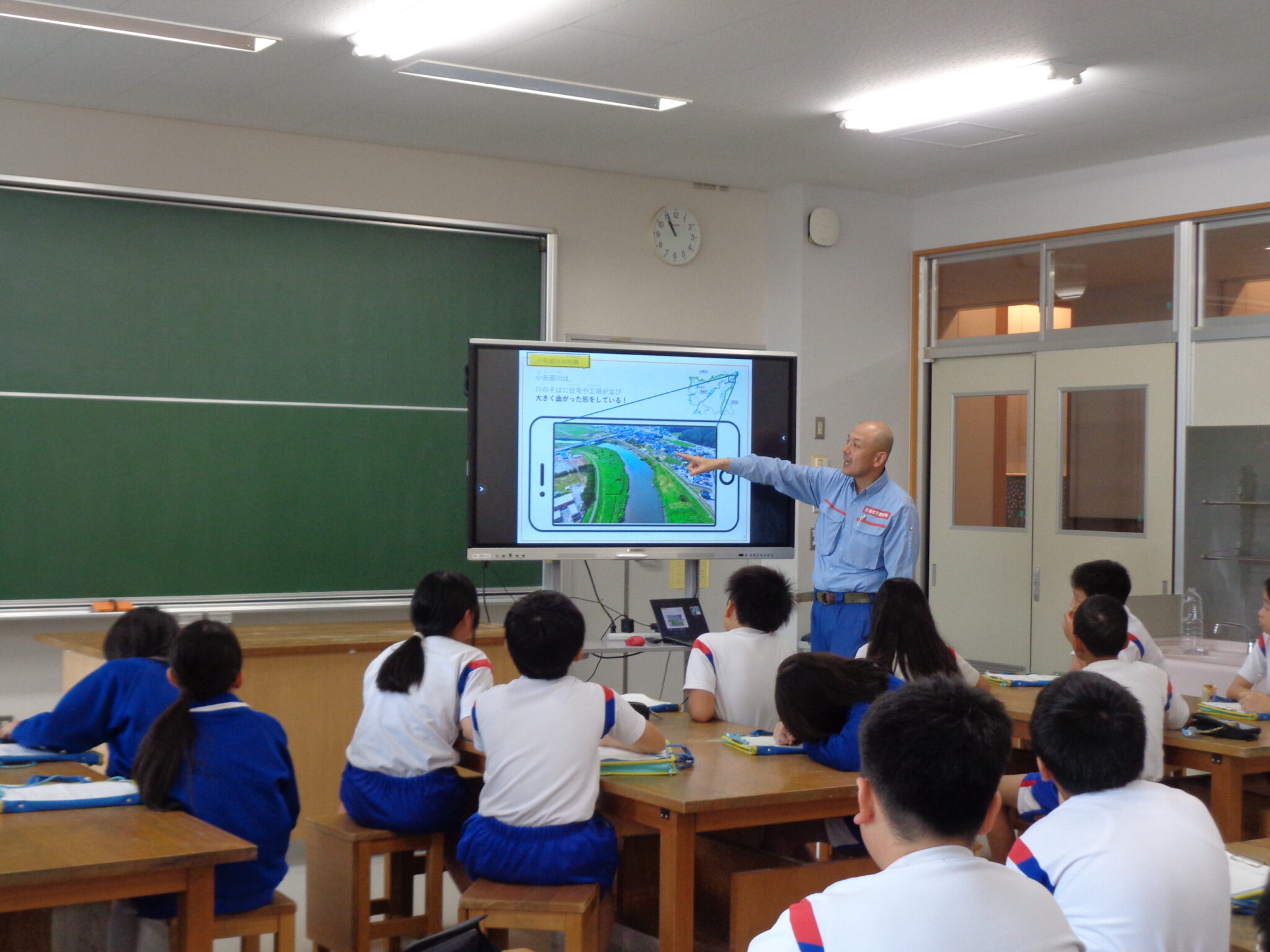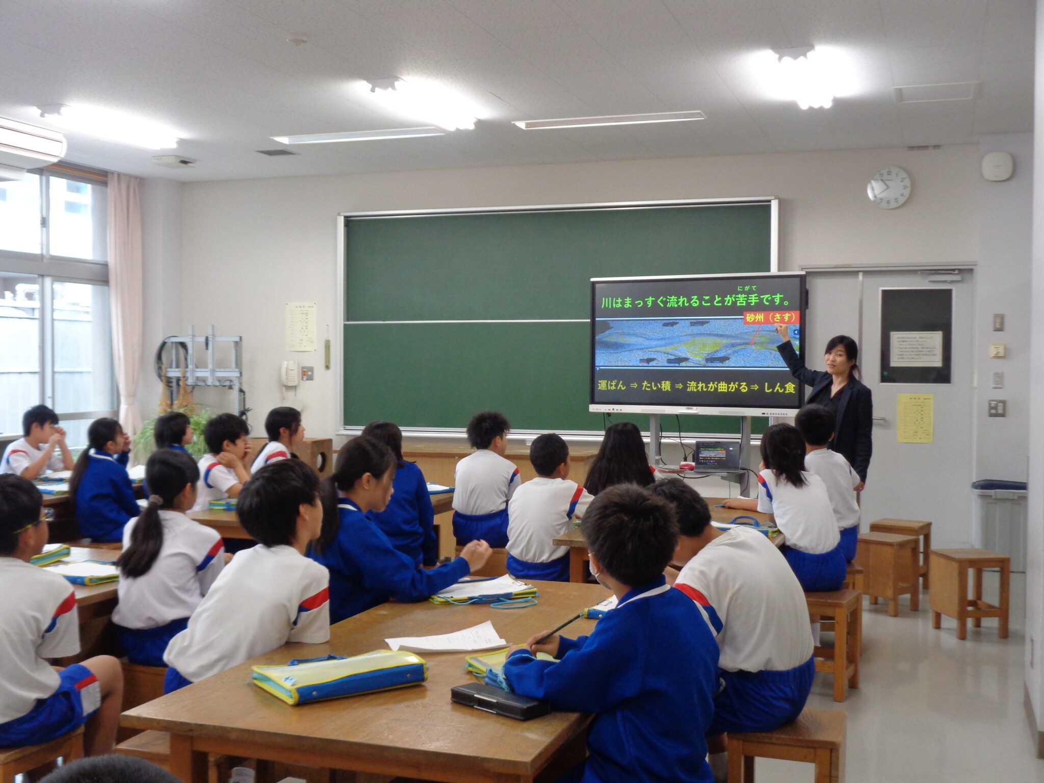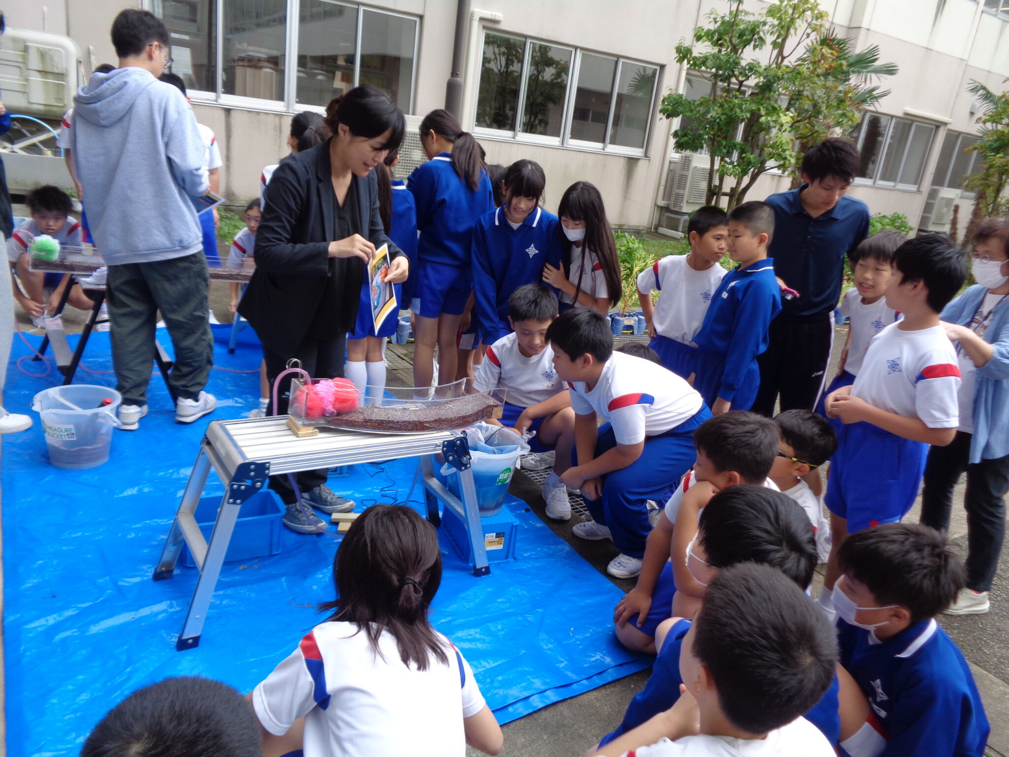 きらめきエンジニア事業「川の中の水の流れと土砂の動き」 2025年10月20日 5年生, 学校 本日10月20日(月)富山県立大学と富山河川国道事務所から講師をお招きし、出前授業をしていただきました。県立大学の講師からは、川の水の流れと土砂の動きについて、富山河川国道事務所から担当の方からは、小矢部川の特徴や治水についてお話を聞きました。最後に持ってきていただいた水路を使って実際に水の流れによって土が動く様子を実験観察しました。理科で学習している「流れる水の働き」の学習を深める機会となりました。