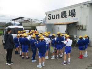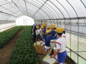 Sun農場さんに見学へ行きました(3年生) 2025年10月22日 3年生 社会科の学習で、Sun農場さんの見学に行きました。 小松菜をはじめ、いろいろな野菜を作っておられるSun農場さんから、小松菜を育てるための工夫や、袋詰めをする工夫などを学びました。 見つけた農家の工夫を、これからまとめて発表し合います。