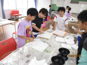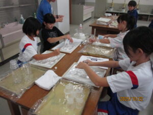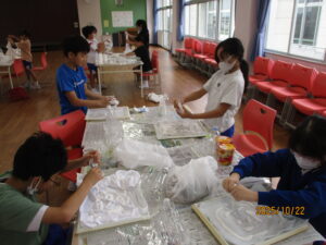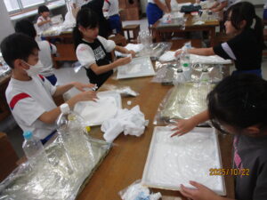 どろどろカッチン(4年生) 2025年10月22日 4年生 図画工作科の学習で「どろどろカッチン」の学習に取り組んでいます。テーマは、「自分の洞くつ島を作ろう!」です。今日は、島の土台づくり。液体粘土を、タオルに染み込ませてもみもみ。そして、ペットボトルや紙コップ、プラスチック容器等で作った土台にかぶせました。 さてさて、どんな作品に仕上がるのか。これから完成に向けて、制作をがんばっていきます。