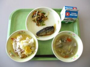 かきまぶり・牛乳・いわしの梅煮・三色あえ・僧兵汁