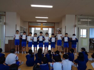 持久走大会の頑張りを称え合いました(6年生) 2025年11月7日 6年生 6年生は、学年朝の会に10月31日(金)に行われた校内持久走大会の入賞者の表彰式を行いました。 小学校最後の持久走大会に向けて、どのような姿で学年として頑張りたいのかについて何度も話し合いました。自己ベスト更新等の個人の目標を立てるだけでなく、整列の列の美しさや時間を守る意識、仲間への温かい応援等の集団としての高みを目指して取り組んだ子供たちでした。 どの子供も練習から精一杯に頑張る姿が見られ、大きな成長となったと思います。応援ありがとうございました。