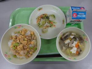 鶏そぼろ丼・牛乳・里いものごまだれあえ・豆腐とずいきのみそ汁