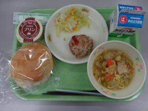 1月28日(水) 2026年1月28日 おいしい給食 【学校給食週間「食べて学んで おいしい給食」 3日目】 〇外国語の献立 ハンバーガー(横割り丸パン・手作りハンバーグ・コールスロー) 牛乳・ABCスープ・プリン