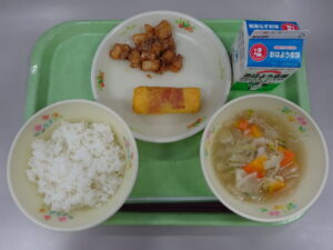 ごはん・牛乳・ベーコン巻き卵焼き・揚げじゃがのそぼろあんかけ・大根のみそ汁