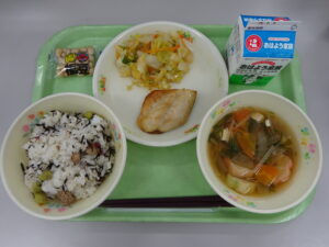 梅ひじきごはん・牛乳・さばの塩焼き・白菜のあえもの・すまし汁・福豆