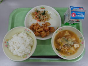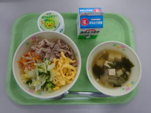 2月13日(金) 2026年2月16日 おいしい給食 【航ならコウスル ごちそう城端プロジェクト】 まぜて完成!航くんとJ6のなんとの彩りビビンバ・牛乳・わかめと豆腐のスープ・青りんごゼリー 城端小学校6年生と城端出身の俳優である池田航さんが考えたビビンバが登場しました。 具は、なんとポークのはちみつ生姜焼き、錦糸卵、にんじんともやしのごま酢あえ・やみつきナムルの4種類でした。彩り豊かなビビンバに子供たちの食も進みました。