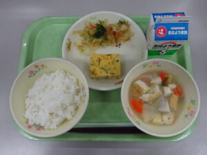 ごはん・牛乳・豚肉入り卵焼き・糸寒天の酢の物・五目みそ汁
