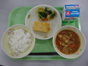 ごはん・牛乳・ツナと大豆の卵焼き・チンゲンサイひたし・マーボー大根