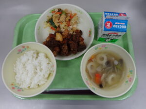ごはん・牛乳・豚肉とレバーの揚げがらめ