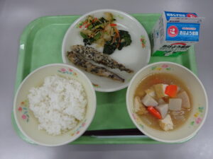 ごはん・牛乳・ししゃもの石垣揚げ・青菜のえのきあえ・大根のみそ煮