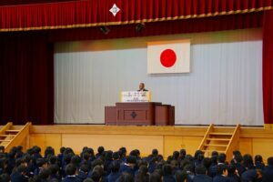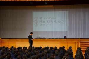 最後に、下田生徒指導主事が、命・外出・メディアをキーワードに、春休みの安全な過ごし方について話をしました。