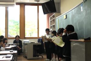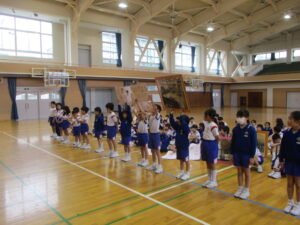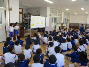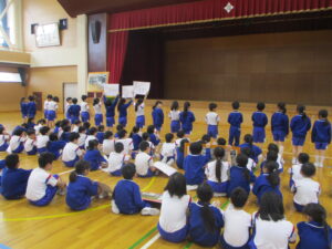 1年生入学おめでとう集会の練習(3年生) 2026年4月24日 3年生, 学校 3年生の子供たちは、4月28日(火)に行われる「1年生入学おめでとう集会」に向けて、替え歌とクイズの出し物の練習を頑張っています。自分から呼びかけに立候補したり、声を合わせて明るく歌ったりする姿がたくさん見られました。明日も、1年生に喜んでもらえるように練習を頑張ります。