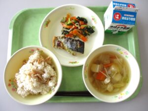 たけのこごはん・牛乳・さわらの若草焼き・たくあんあえ・白菜のすまし汁