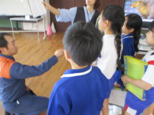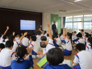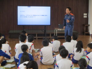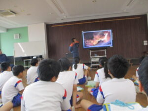 砺波地域消防組合南砺消防署東分署のお二人にお越しいただき、リチウムイオン電池による火災の原因などを説明していただきました。火災件数を知ることや、動画を見て危険な火事につながることを確認しました。子供たちの中で、「自分たちの町を火災から守りたい。」「リチウムイオン電池の危険性や、ゴミの正しい分別方法を広めたい。」という声が聞こえました。