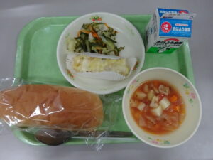 コッペパン・牛乳・マカロニグラタン・茎わかめサラダ・ミネストローネ