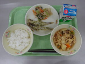 ごはん・牛乳・ししゃもの磯辺揚げ・大根の酢の物・親子煮