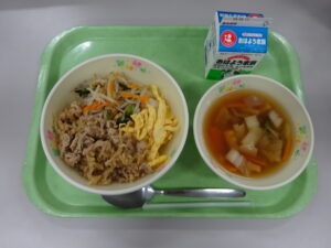 ビビンバ(焼肉・錦糸卵・ナムル)・牛乳・ワンタンスープ