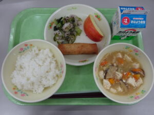 ごはん・牛乳・春巻・赤じそあえ・えびと豆腐のうま煮・りんご