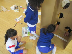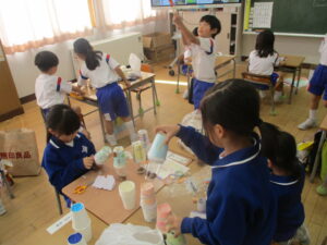11月にある幼稚園や保育園との交流学習で使うために、1年生は一生懸命準備をしています。