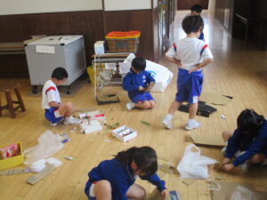 校外学習で集めてきたどんぐりや、家から持ってきた材料を使って、秋のおもちゃづくりをしています。