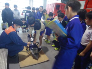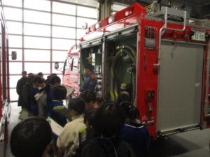 消防士の仕事や、仕事で使われる車両・道具の説明をしていただきました。