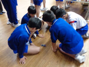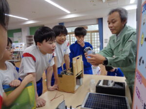 授業では、地球温暖化のことやカーボンニュートラル、そして今理科で学習している電気の利用について学習しました。太陽光、水力、風力等、二酸化炭素を出さずに発電する方法について、体験をしながら学ぶことができました。