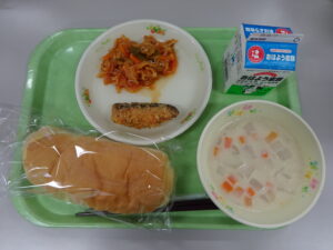 コッペパン・牛乳・さけの香草揚げ・切干大根のナポリタン風・かぶのポタージュ