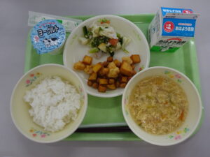 1月26日(月) 2026年1月26日 学校, おいしい給食 【学校給食週間「食べて学んで おいしい給食」 1日目】 〇理科の献立 ごはん・牛乳・さつまいもの揚げがらめ 茎・葉・花・実のサラダ・ねぎたっぷり卵スープ・ヨーグルト
