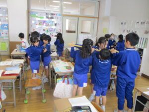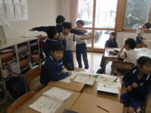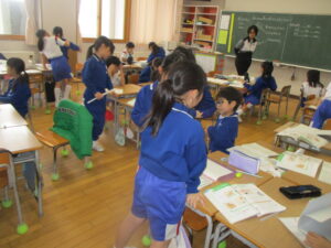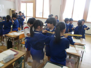 長い長さをはかろう(2年生) 2026年1月29日 2年生 2年生は、算数科の学習で、長いものの長さを測る学習をしています。 両手を広げた長さを測るときは、短い定規では測りにくいことや、 1mの定規を使うと測りやすいことなどに気付きました。