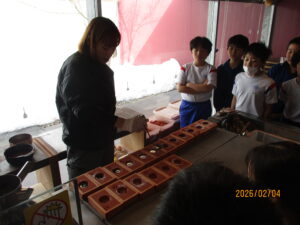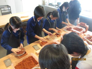 体験活動では、錫の箸置きをつくりました。型を砂で押し固めてつくります。出来上がった型に溶けた錫を入れますが、塊の錫がチョコレートのように溶けていく様子にびっくり!出来上がったものは、箸置きやペーパーウェイト、また花瓶の中に入れると抗菌作用があり花が長持ちするなど、様々な用途で使えるそうです!