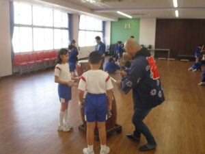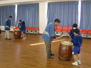 夜高太鼓の基本となる小ばちと、迫力のある大ばちの叩き方を習い、その後に二つのリズムを合わせて演奏しました。