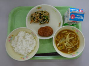 ごはん・牛乳・メンチカツ・納豆あえ・カレーうどん汁