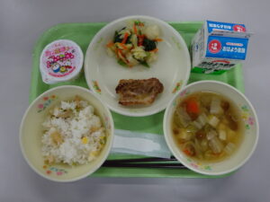 ちらし寿司・牛乳・鶏肉のごま焼き・わさびあえ・うすくず汁・三色花ゼリー