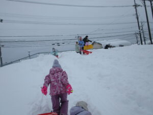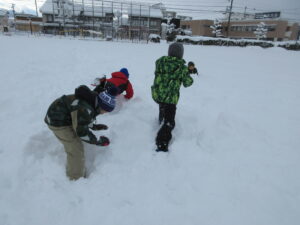 1年 生活科 雪遊び 2026年1月26日 1年生 1年生は、生活科の学習で雪遊びをしました。友達と一緒に大きな雪玉を作ったり、ころころ山からそりで滑ったりして遊びました。子供たちは「つめたーい!」といいながら冬を感じ、楽しい時間を過ごしました。